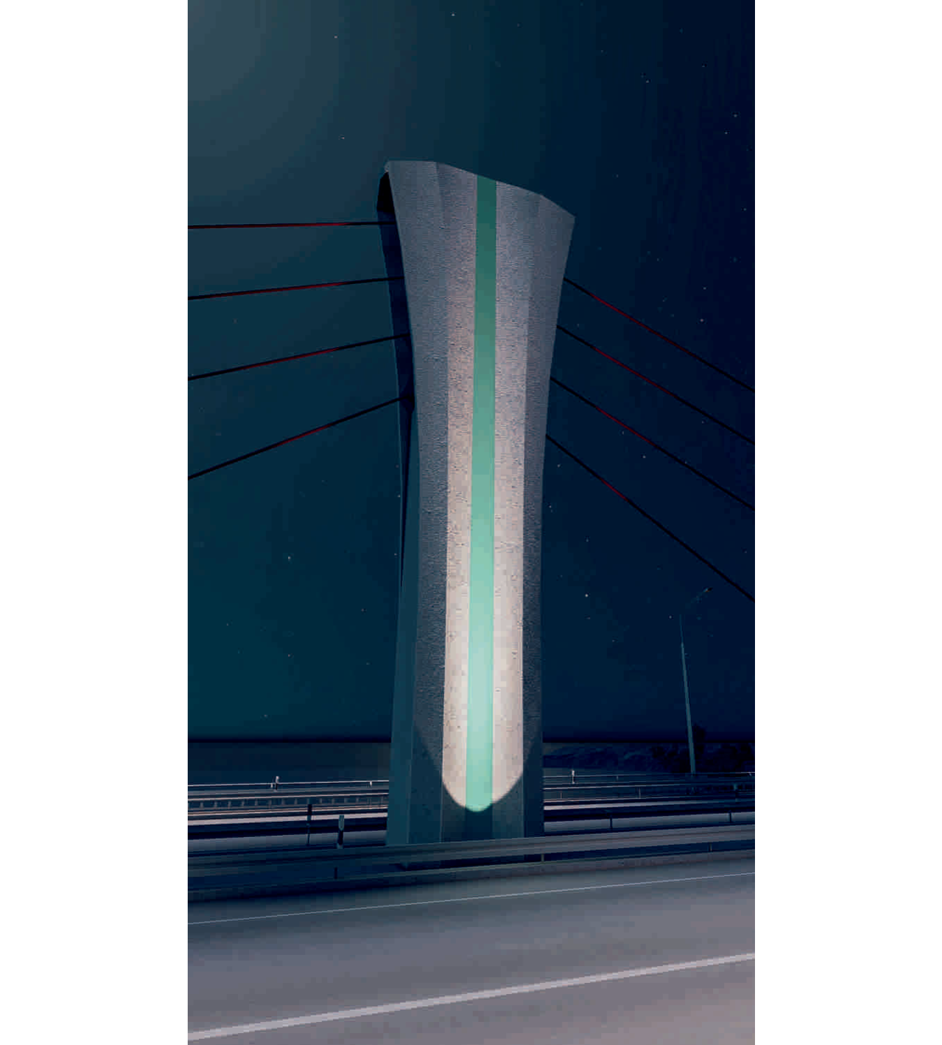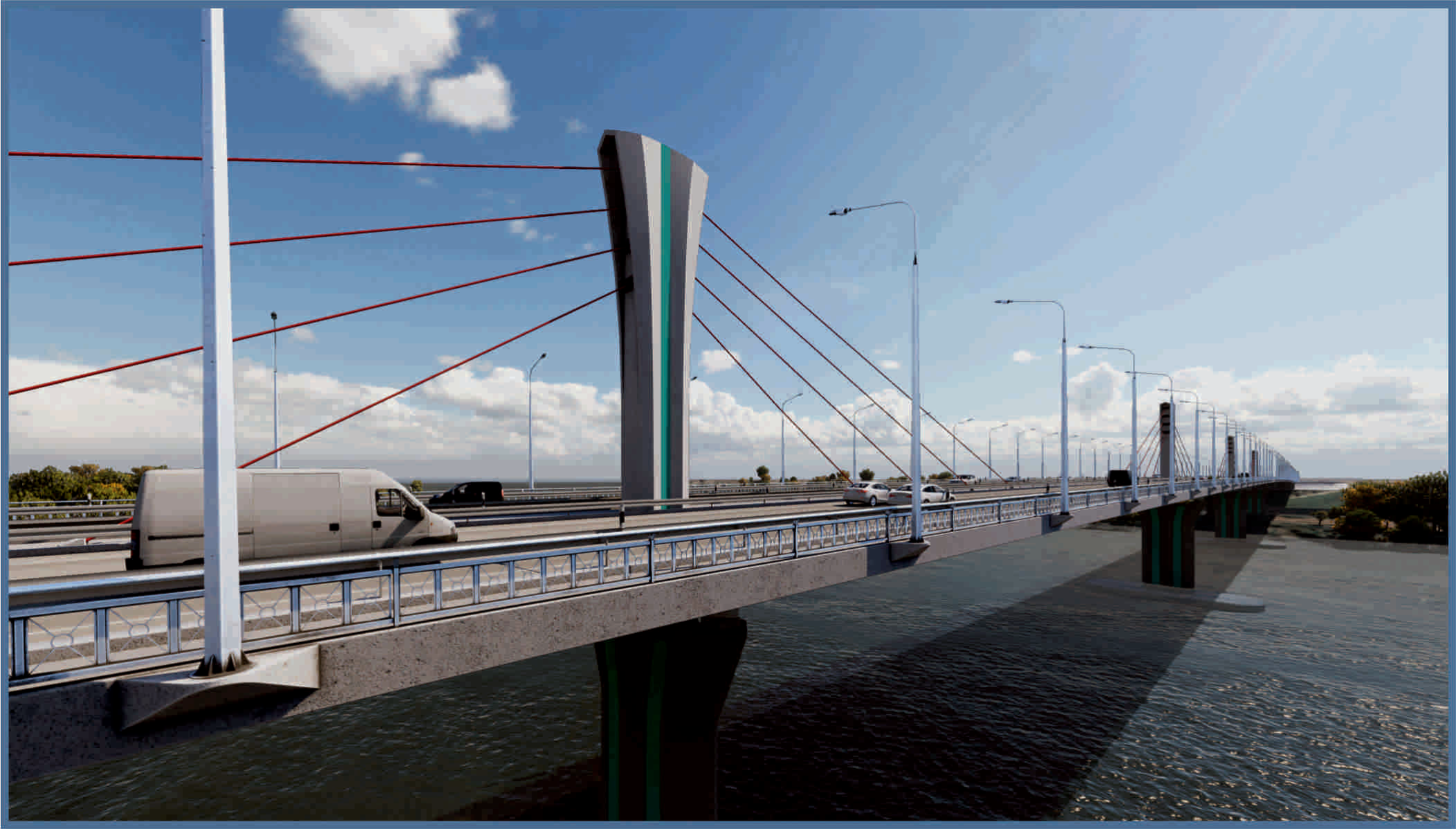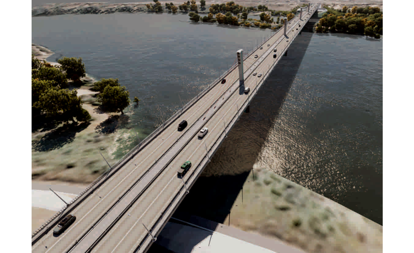 Экстрадозный мост по схеме 114+3х150+114м общей длиной 690,7м и шириной 31,62м с судоходным пролетом 150м. Пролетное строение монолитное неразрезное предварительно напряженное высокопрочными канатами состоит из одной коробки с двумя консолями в поперечнике для двух направлений движения автотранспорта. Опоры железобетонные монолитные 2-х типов: промежуточные и береговые. Промежуточные опоры имеют короткие пилоны высотой 20м и тело опоры с ледорезной частью, береговые опоры стоечные по верху объединенные общим ригелем. Основание опор на буровых сваях диаметром D-1.5м, сваи по верху объединены монолитным железобетонным